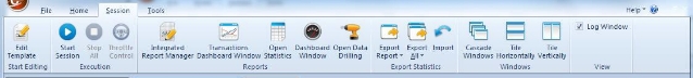 The ribbon displays the commands you use to work with WebLOAD Console. In addition to the standard File tab, various tabs are provided to access functions specific to template creation and session management, such as the Session tab.