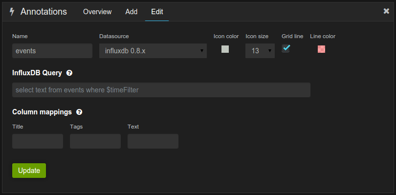 dropdown. This will open the Annotations edit view. Click the Add tab to add a new annotation query.