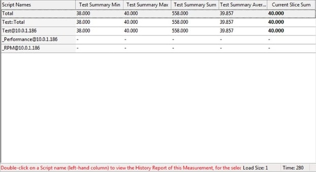 - ScriptName::Total ‒ Sums the values for each statistic across all instances of the specified script running during the test.