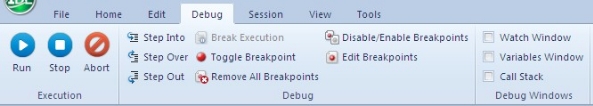 The Debug tab contains commands to start the debugging process. The following options are available through the Debug tab.
