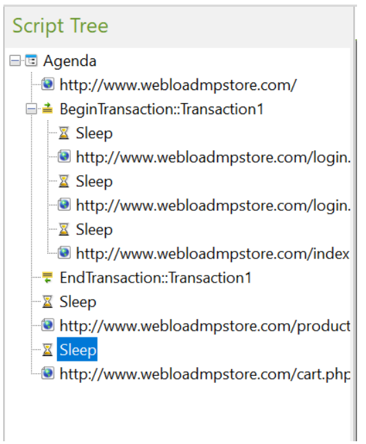 Your actions are recorded and appear in the Script Tree as you navigate the site. (If you see additional nodes in the Script Tree with different URLs, this may be traffic generated by browser plug-ins or extensions, for example, third-party toolbars.)