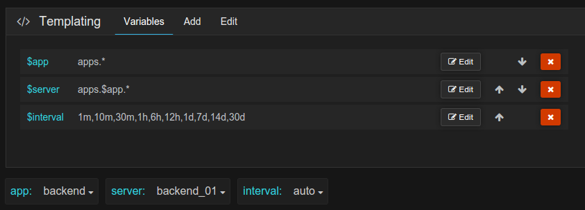 You can even create nested variables that use other variables in their definition. For example apps.$app.servers.* uses the variable $app in its own query definition.